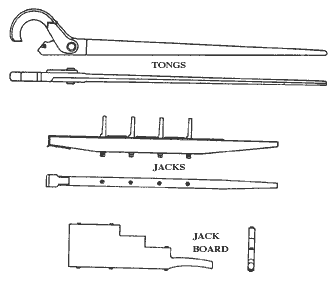 The basic tools and devices used for many years by the tong gang in the laying of pipes were simple and still serve locally on some leases. The tongs were used mainly to assist screwing the joints together. The jack and jack board held the pipes steady at the desired level for work. Illustrations after Loos (1959).