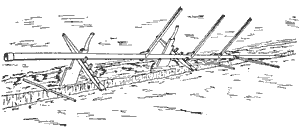 In this drawing a ditch has been dug by the ditchers and the pipe carried to its position with the use of the carrying bar, two of which are seen lying across the ditch. The pipe is held at various heights by the pegs on the jack which in turn is supported at various heights by the jack board. The pipe is ready for screwing into the collar of the previously laid joint. This operation is swift, skilled and requires many men. Illustration from Loos (1959) and designated as pipe laying methodology of 1909. Similar practice began long before then, probably in the 1870's. The early learning curve for laying oilfield pipe covered the 1860's (primitive) and began to improve in the 1870's.
