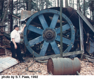 I decided to look around a little bit more and crossed a lease road which gave me my first glimpse of an abandoned cable tool drilling rig practically on the lip of the very steep ravine of Gregg Run. It had turned into an "amusement park for squirrels". The first gray I saw was sitting on the band wheel eating acorns. I walked slowly toward the drilling machine and spooked that gray squirrel and about eight others that jumped off the gears and wheels. The one I had my eye on jumped onto the derrick, ran to the top and leaped right into a hole in a beech tree and disappeared.