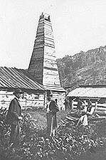 The engine house of the Drake Well in 1861. Drake with top hat, standing (right). Peter Wilson, Drake's friend and druggist in Titusville. Photo from Drake Well Museum.