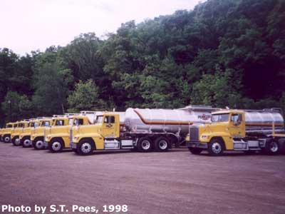 Part of the Pennzoil tank truck fleet of the 1990s based on Cherry Run (Rt. 227, Cornplanter Twp., Pa.) near Rouseville. These tank trucks carried unleaded gasoline to gas stations from the nearby Pennzoil refinery on Rt. 8 along Oil Creek between Oil City and Rouseville, Pennsylvania. This part of the Pennzoil operation in the old oil district was sold to Ergon Inc. in 2000. Photo by S.T. Pees, 1998.