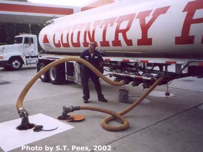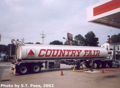 CITGO gasoline being discharged into the underground tanks of a Country Fair gasoline station (combined with a convenience store) in Union City, Pa. This type of tank trailer normally carries 8700 gallons of gasoline although the rated capacity is 9200 gallons. The truck is owned and operated by Petro-Chemical Transport (PCT), Addison, Texas. Photo by S.T. Pees, 2002.