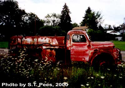 Along the edge of the woods or in a far corner of the lease one might find an old battle-scarred tank truck out of service. The once bright colors have faded, but sometimes the name of its long-ago owner can be made out on the rust-spotted doors. The chances are that many of these abandoned tank trucks had spent their working life picking up crude oil from the stock tanks in the lease and carrying it to the refinery. Most of the miles were driven on rutty access roads that hadnt seen a blade for a generation. Unless theyre hauled away for junk, these distressed tankers join the other ponderous artifacts remaining in the abandoned shallow oil fields in Pennsylvania and elsewhere. In a "bone yard" familiar to the author, there are truck wheels with wooden spokes and solid rubber tires along with other discarded equipment that had seen its day in a by-gone era.